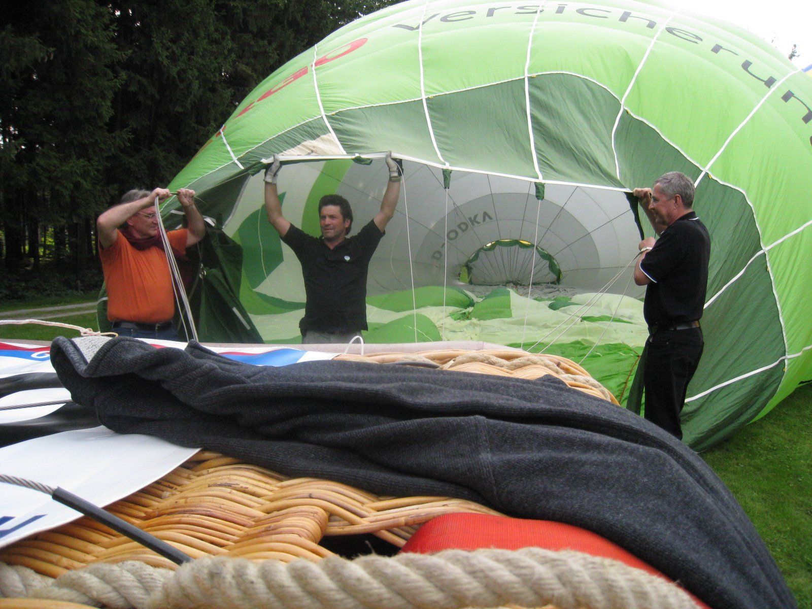 gemeinsam aufgerüstet. Zusammen mit den Gästen wird der Korb mit den Gasflaschen und dem Brenner bestückt und mit der Hülle durch Karabiner verbunden. Die Hülle wird ausgelegt und mit dem Ventilator mit Kaltluft angefüllt. Den Rest erledigt der Pilot mit dem Brenner – die heiße Luft stellt den Ballon auf.